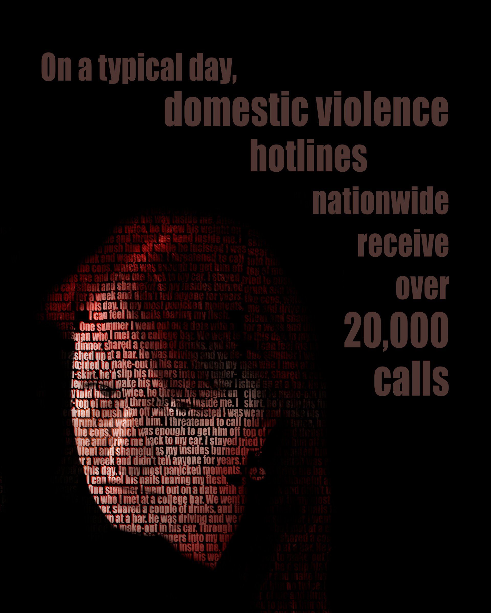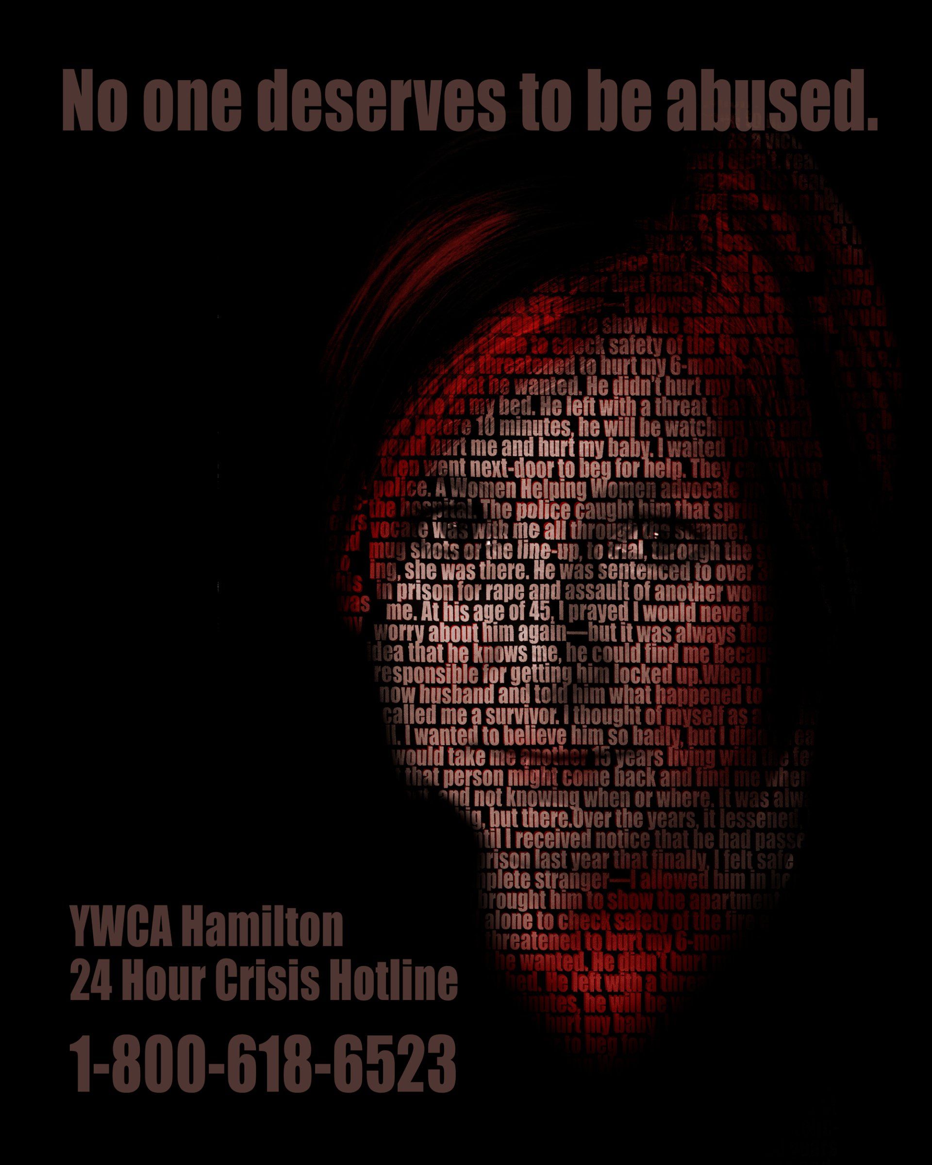 "In response to an invitation to participate in the Fitton Center for Creative Arts "25 - Human Rights" exhibit and inspired by Jackson Katz's work this series was created. Women Helping Women & the YWCA Hamilton put a call out for women to come forward & share their stories of violence and abuse. The women were asked to write their stories and be photographed to produce this collection of moving images. By photographing the images from a dominant position and molding their stories onto their faces, very personal and emotional impact was created.